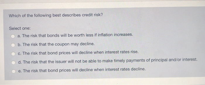Solved Which Of The Following Best Describes Credit Risk Chegg Com