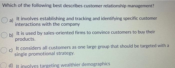 Customer relationship management systems were developed Which of the following best describes CRM. Which of the following does NOT accurately describe customer relationship management. Managers use CRM to replace general promotions with targeted mailings to preferred customers.